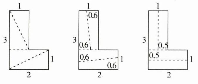 2. 把一个不规则图形分成形状相同、面积相等的四份,图中已经画出了一种分法,请你再画出三种不同的分法,并在图中标出必要的数据。(单位:厘米)(6分)
