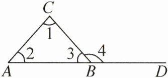 4. 如图,把三角形ABC的边AB延长到点D,那么$\angle 1+\angle 2$(