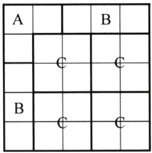有三种型号的钢板A、B、C分别由3、3、4个$1× 1$的小正方形组成,现有A型钢板7块,需购进B、C两种型号的钢板若干块,不重叠、无缝隙地拼成$5× 5$的正方形钢板2块。已知B型钢板每块500元,C型钢板每块400元,请考虑B、C两种型号的钢板各购多少块,才能使所花的钱最少? 计算出最省钱的方案,并画出设计图。