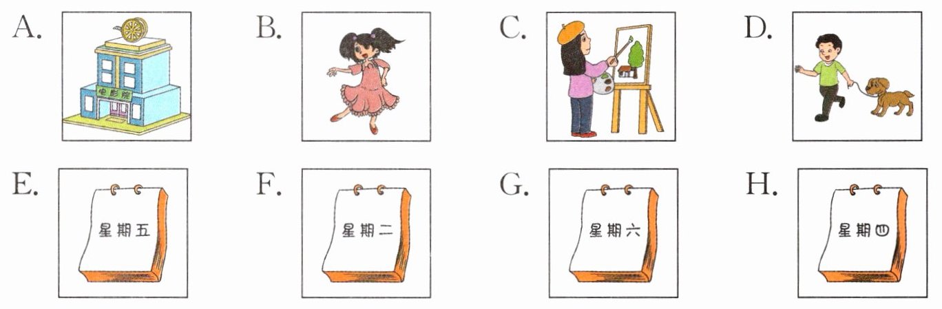 五、【新颖题】老师正在问同学们他们在不同的日子会做哪些事。请根据他们的对话,将人物与图片匹配。(听两遍)(24 分)