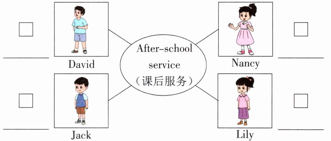六、【新颖题】学校里的课后延时活动正如火如荼地展开着。根据所听内容,写出与人物匹配的课后延时活动,并将图片排序。(听两遍)(20 分)