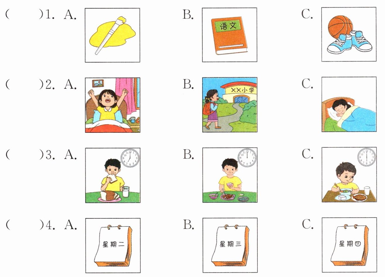 )2. A. Two o'clock. B. Time for Music. C. It's Friday.(