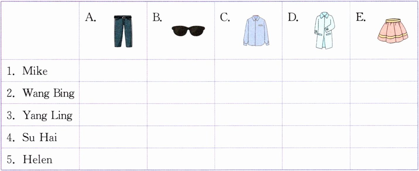 五、【新颖题】听录音,根据所听对话,在表格中相应的位置画“√”。(听两遍)(20 分)
