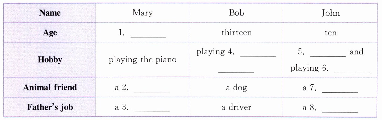 1. twelve 2. cat 3. doctor 4. table tennis 5. swimming 6. basketball 7. fish 8. teacher