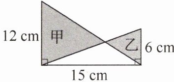12×15÷2=90(平方厘米) 6×15÷2=45(平方厘米) 90-45=45(平方厘米) 提示:根据题意可知甲、乙的面积之差实际上相当于底为12厘米、高为15厘米的三角形与底为6厘米、高为15厘米的三角形的面积之差。