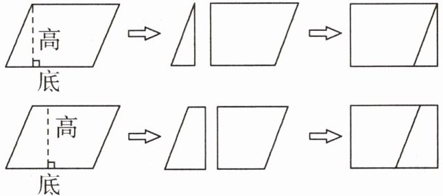 1. 如下图,把平行四边形沿高剪开,把三角形或梯形向右平移拼成一个长方形。