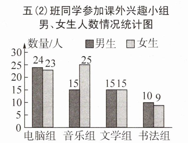 1. 下图是五(2)班同学参加课外兴趣小组的男、女生人数情况统计图。