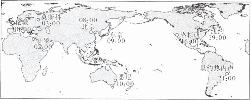 (2024·山西中考)人类共同生活在地球家园,不同地区存在着时间差异。为方便旅客,很多酒店大厅墙壁上挂着世界部分城市的电子时钟。下图示意某酒店的电子时钟。读图回答 7~8 题。