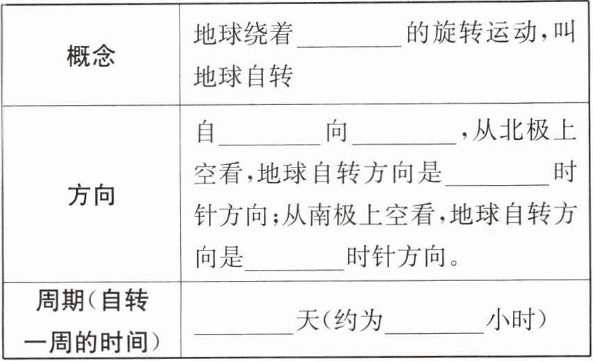 |方向|自______向______,从北极上空看,地球自转方向是______时针方向;从南极上空看,地球自转方向是______时针方向。|