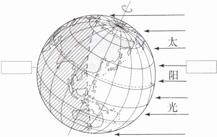 1 自转产生昼夜的更替。在图中方框内,注明白昼和黑夜,并在北极处画箭头标注地球自转方向。