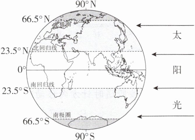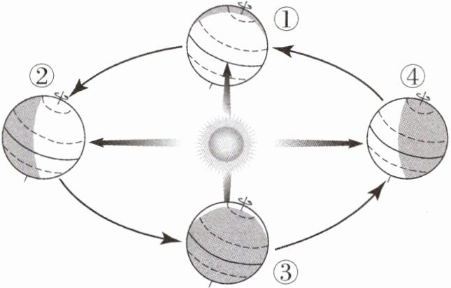3. A 4. B [解析]第3题,图中①处为春分日(3月21日前后),②处为夏至日(6月21日前后),③处为秋分日(9月23日前后),④处为冬至日(12月22日前后)。所以世界第65个“世界气象日”(3月23日)当天,地球公转至①处附近。第4题,结合上题分析可知,由①处运行到③处,即春分→秋分,此时段太阳直射北半球,先持续北移再持续南移。