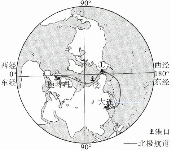 6.D 7.B [解析]第6题,读图可知:我国位于亚洲东部,东临太平洋;鹿特丹位于欧洲西部,西临大西洋;亚洲和欧洲都北临北冰洋。因此,沿北极航道从我国大连出发至鹿特丹,依次经过的大洋是太平洋、北冰洋、大西洋,不经过印度洋。第7题,该图是以北极点为中心的地图。从东西方向看,②位于①的西方;从南北方向看,②更靠近北极点,②位于①的北方。综上所述,②位于①的西北方,所以由①地到②地的航行方向为自东南向西北。
