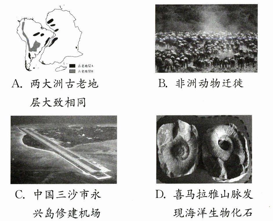 11.D 12.A 13.D [解析]第11题,据材料可知,该地原来有螺蛳,而螺蛳生活在水中,说明该地曾经是水域,后来由于地壳变动,成为陆地;由材料无法得出该地地形平坦、极度干旱、人口众多的结论。第12题,据材料可知,文中所述现象是地壳变动造成海洋变成陆地,与人类活动和大陆漂移无关;海平面上升会使陆地变成海洋,不会使海洋变成陆地。第13题,文中现象是海洋变为陆地,属于海陆变迁现象,是地壳变动造成的。A选项"两大洲古老地层大致相同"是因大陆漂移形成的现象,与地壳变动无关;B选项"非洲动物迁徙"与气候有关,与地壳变动无关;C选项"中国三沙市永兴岛修建机场"与人类活动有关,与地壳变动无关;D选项"喜马拉雅山脉发现海洋生物化石"是地壳变动造成的海洋变成陆地,与文中现象形成过程最相近。