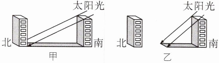 (4)甲、乙两图为西安市夏季和冬季正午时刻楼房的影长,其中甲为冬季,乙为夏季。因为我国位于北半球,冬至日太阳直射南回归线,北半球太阳高度角最小,物影最长,因此为了确保房间一年四季都能有阳光,应该在物影最长的冬季去看房。