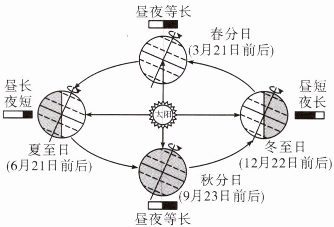 (2)读图并依据所学知识可知,小明家乡位于西安(34°N),昼短夜长的时间段是秋分—冬至—次年春分;白昼逐渐变短的时间段是夏至—秋分—冬至,小明家乡昼最长夜最短的节气是夏至,夏至过后,太阳直射点往南移动,该地的昼夜变化情况是昼渐短夜渐长。