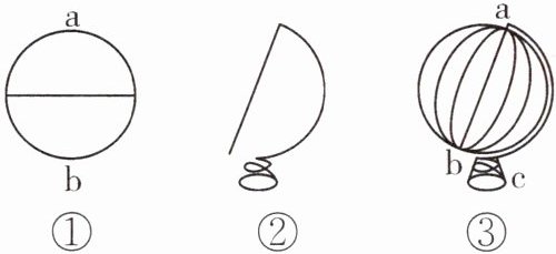 (2)如图①所示,在乒乓球的中部用红笔画上一个圆圈代表赤道,在a、b两处各钻一个小孔分别代表______和______,使小孔到赤道上各点的距离______。