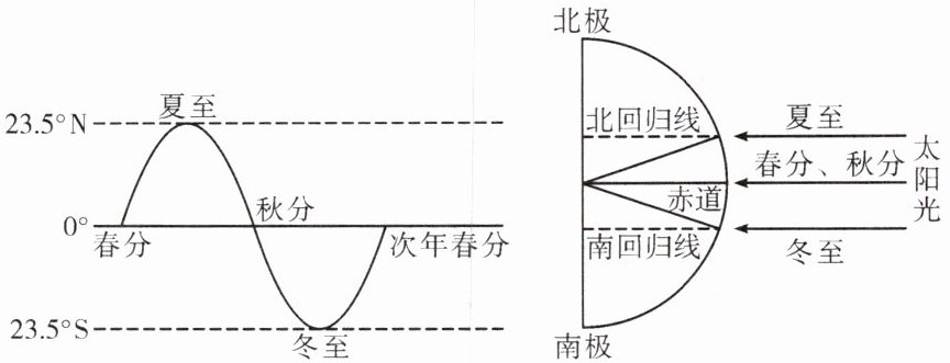 (1)读图并结合所学知识可知:黄道面和赤道面的夹角叫黄赤交角,黄赤交角的度数是23.5°,黄赤交角的度数和南、北回归线的度数相等,所以太阳直射点的移动范围是南、北回归线之间(23.5°N~23.5°S);太阳直射点位于北回归线上的节气是北半球的夏至,太阳直射点位于南回归线上的节气是北半球的冬至,太阳直射点位于赤道上的节气是北半球的春分和秋分;热带地区(23.5°N~23.5°S)有阳光直射现象,小明的家乡在西安(34°N),所以无阳光直射现象。