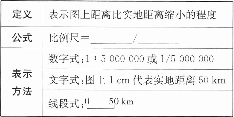 |表示方法|数字式:1∶5 000 000或1/5 000 000文字式:图上1 cm代表实地距离50 km线段式:0______50 km|