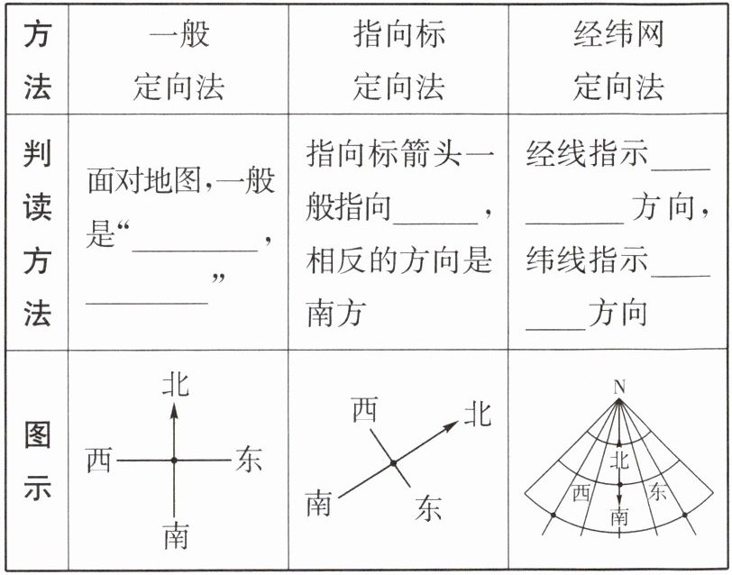 |判读方法|面对地图,一般是“______,______”|指向标箭头一般指向______,相反的方向是南方|经线指示______方向,纬线指示______方向|