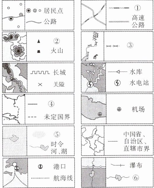 地图上的图例有各种符号和注记,分别表示一定的地理事物。在下图中填写图例表示的地理事物含义。