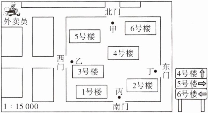 5 甲、乙、丙、丁为四块面向最近大门的小区楼号指示牌。当外卖员从大门进入小区后,看到如图所示的指示牌,则该指示牌位于( )