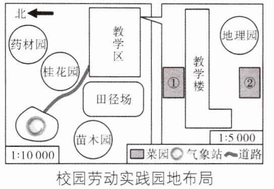 8.D 9.C [解析]第8题,读图可知:药材园、桂花园、苗木园图上大小相同,且比例尺相同,所以其实地面积相同;地理园与其他三园图上大小相同,但比例尺更大,所以其实地面积比其他三园小。第9题,读图可知,指向标指向左侧,左侧为北,所以①位于教学楼的北面,②位于教学楼的南面。该教学楼位于长沙,在北回归线以北,南面为向阳面,光照较好。