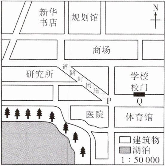 (3)步骤三:阅读地图。该图中判断方向的依据是______,新华书店在学校的______方向。按步行距离最短原则,同学们行至十字路口P时,考虑实际路况应在该十字路口向______(填方向)行走。