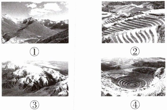 5 分层设色地形图主要表示五种基本地形类型,除了平原外还有下面①②③④四种,它们的名称依次是( )