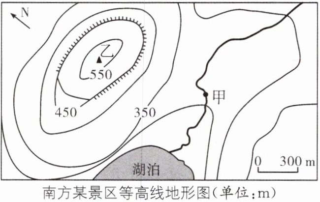 6.A 7.D [解析]第6题,甲处有河流流经,地势相对于两侧低,为山谷;图中等高距是50 m;乙山峰相邻外围等高线数值为550 m,所以乙山峰的海拔高度为550~600 m;从东南方向攀登乙山会经过陡崖,难度大。第7题,读该景区等高线地形图可知:该景区大部分地区海拔在300~600 m,地势起伏较大,地形以山地、丘陵为主;甲地位于河流附近,甲地的污染物会随着河流注入湖泊,使湖泊遭到污染;乙地周围的等高线重叠,有陡崖分布,由于周围峭壁林立,乙地易守难攻;该图使用的是线段式比例尺,图上1 cm代表实地距离300 m,所以图上距离2 cm代表实地距离600 m。