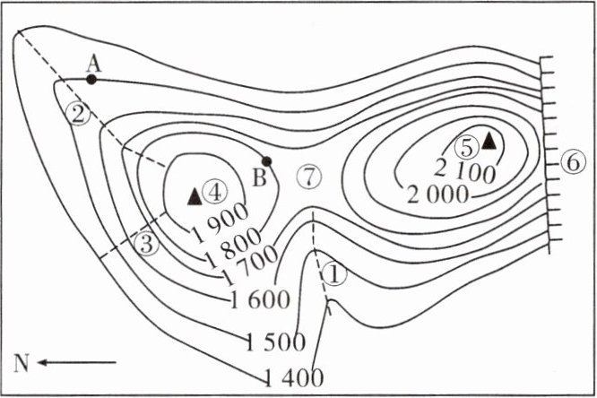 2.C 3.A [解析]第2题,读图可知,图中①处的等高线往海拔高的方向凸出,为山谷;等高线重叠处为陡崖;等高线往海拔低的方向凸出为山脊;两侧的山脊、山谷等高线近似对称为鞍部。第3题,读图可知:图中②线比③线等高线稀疏,坡度较缓,沿②线登山比沿③线登山更容易;该图等高距为100 m;根据图中指向标判断,⑤位于④的东南方向;该区域地形以山地为主。