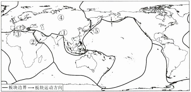 19.B 20.C [解析]第19题,①位于两大板块碰撞挤压处,因此①处山地将升高;②位于两大板块张裂处,因此②处海域将扩大;③处位于板块碰撞挤压处,地壳活跃;④位于板块内部,地壳比较稳定,不易发生火山、地震等灾害。第20题,⑤地位于亚欧板块与太平洋板块交界处,地壳比较活跃,因此频繁发生地震;⑤地发生地震与其海陆位置、地形等关系不大。