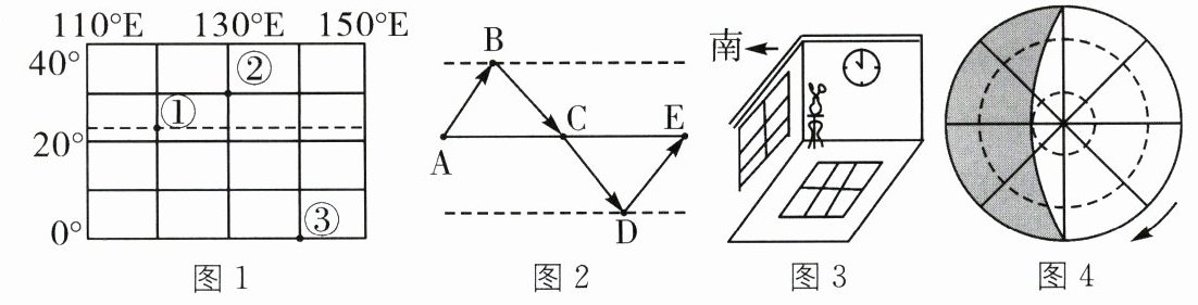 (1)“坐地日行八万里”指的是随着地球自转,一天移动大约40000km。地球自转的周期是一天,赤道周长约40000km,所以赤道上的点符合诗句情况,③位于赤道,所以相符的是③地。赤道上的点一年会有2次太阳直射现象。从赤道向北行进,最终会到达北极点,不能回到原点。
