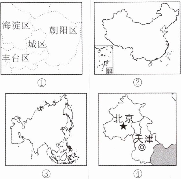 北京某中学教室的墙壁上张贴了四张图幅大小相等的地图。图①是北京部分政区图,图②是中国地图,图③是亚洲地图,图④是北京和天津地图。读图回答2~3题。