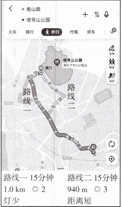 (2024·山东青岛一模)家住鱼山路的小明同学到青岛信号山公园游玩,用手机导航软件搜索出行路线方案,下图示意手机导航截屏。读图回答4~6题。
