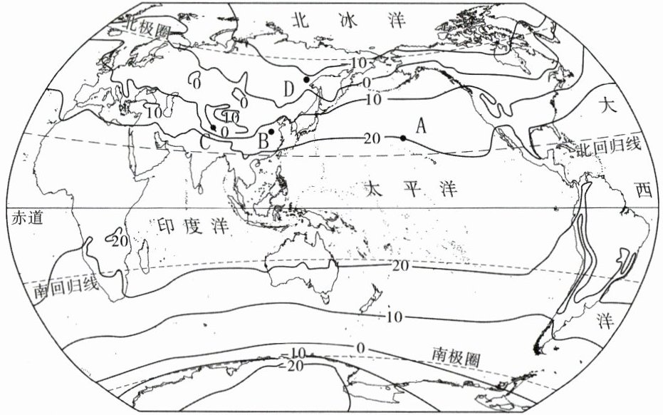 5. 下列关于图中A、B、C、D四地气温的说法,正确的是( )