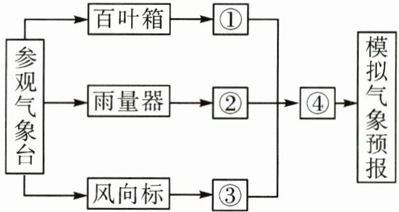 1.A 2.D [解析]第1题,从大气中降落的雨、雪、冰雹等统称为降水,寒潮属于剧烈降温现象。第2题,百叶箱是安置温度计、湿度计并使其免受太阳直接辐射,而又保持适当通风的白色百叶式木箱,可用来测量大气温度;雨量器是测量降水量的基本仪器;风向标是测定风向的设备;百叶箱、雨量器、风向标可用来观测记录大气状况,不能用来观察河流流量。