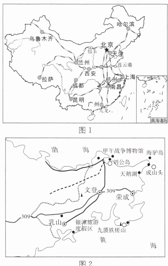 9 暑假期间,青海省西宁市初一学生小林和爸爸妈妈一起到威海游玩。图1为中国主要铁路线分布图,图2为威海市旅游景点图。读图回答下列问题。