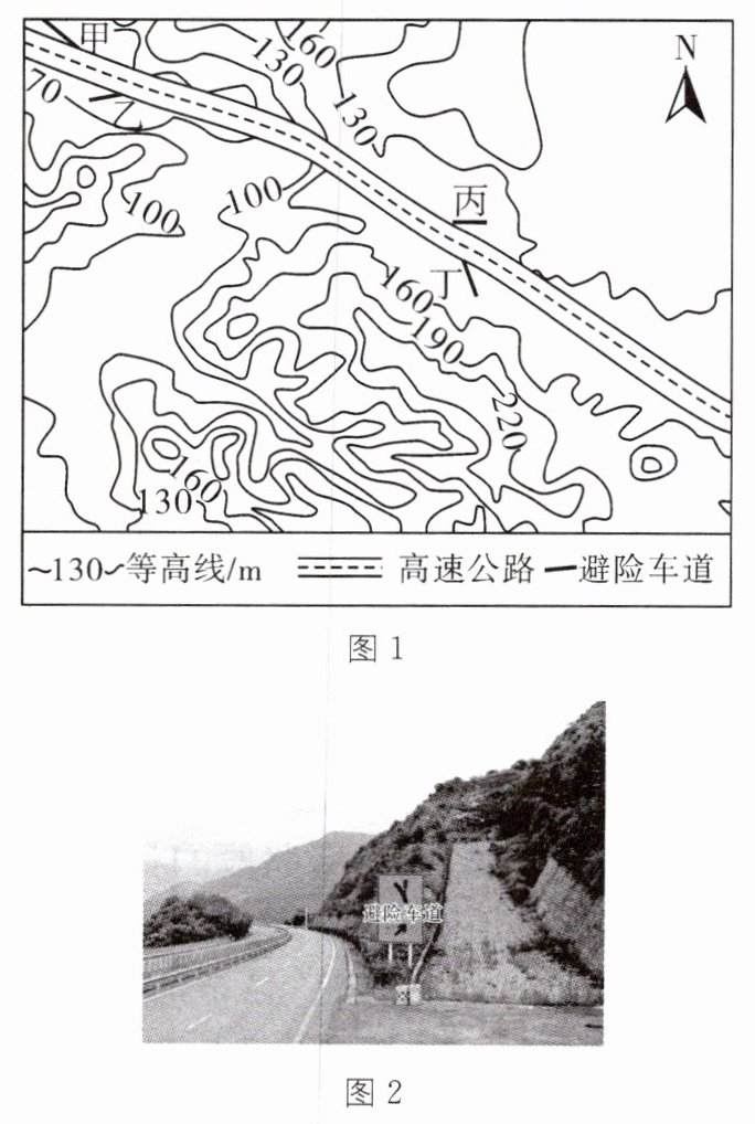 (2024·泸州中考改编)图1为我国南方某欠发达乡镇的局部等高线地形图。近年来,该乡镇大力发展竹编产业、助力乡村振兴。在公路的长下坡路段,为了防止车辆(特别是重载大货车)刹车失灵而发生交通事故,往往设置避险车道(图2)。据此回答8~9题。