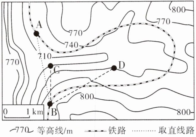 (2024·长春中考改编)地形往往影响交通线的分布。随着桥梁和隧道工程技术的发展,很多呈“灯泡”形迂回的普通铁路线实现了“裁弯取直”,发展了高速铁路。右栏图为某地等高线地形图与铁路线分布图。据此回答6~7题。