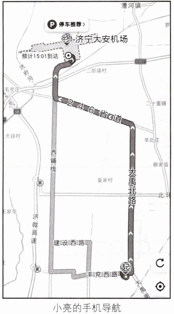 (2024·济宁中考)2024年春节期间,家住兖州区李家湾小区的小亮一家从大安机场乘飞机外出旅游,用手机导航确定去机场的路线,屏幕显示如下图。据此回答4~5题。