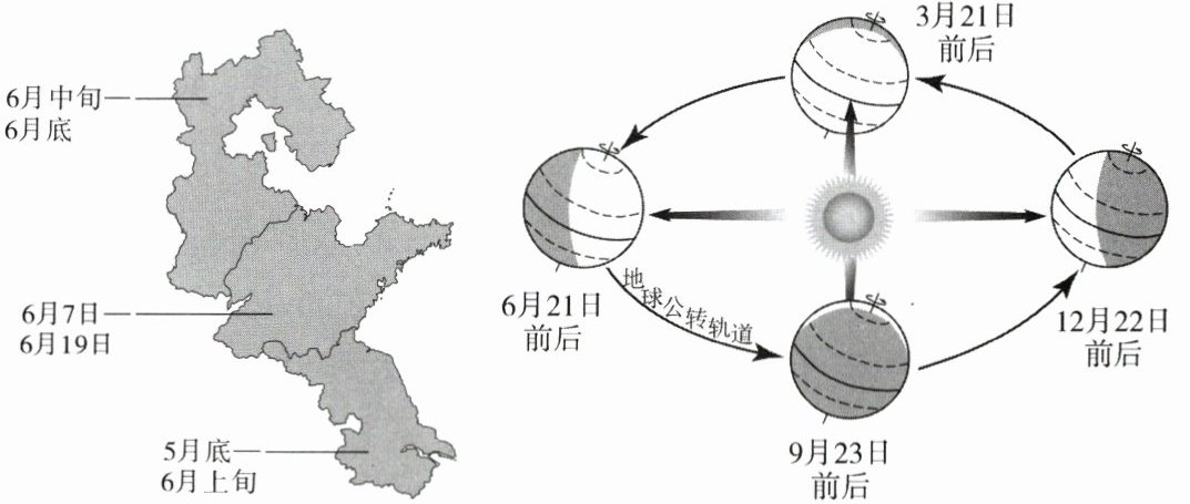 (2024·无锡中考)北斗卫星导航系统是我国自主建设、独立运行的全球卫星定位与通信系统。麦收时节,搭载了北斗终端的收割机在全国多地农田收割小麦。下图示意我国部分地区小麦成熟时间和地球公转轨道。读图回答14~16题。
