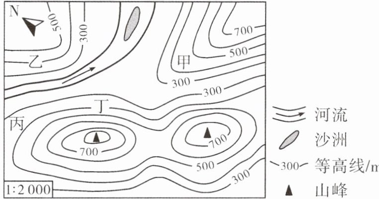 10. 解:在等高线地形图中,判断能否看见某地需考虑视线是否被遮挡。沙洲位于河流中,甲地位于沙洲上游,中间无高大地形阻挡,河流在山谷中,从沙洲可看到甲地的河流;乙地位于山坡,与沙洲之间有等高线向低处凸出的山脊(等高线300米处)阻挡视线;丙地的梯田在图中未明确显示,且丙地所在区域等高线较密集,可能为陡坡,不易形成梯田;丁地位于两个山峰之间的鞍部,并非陡崖(陡崖等高线重合)。