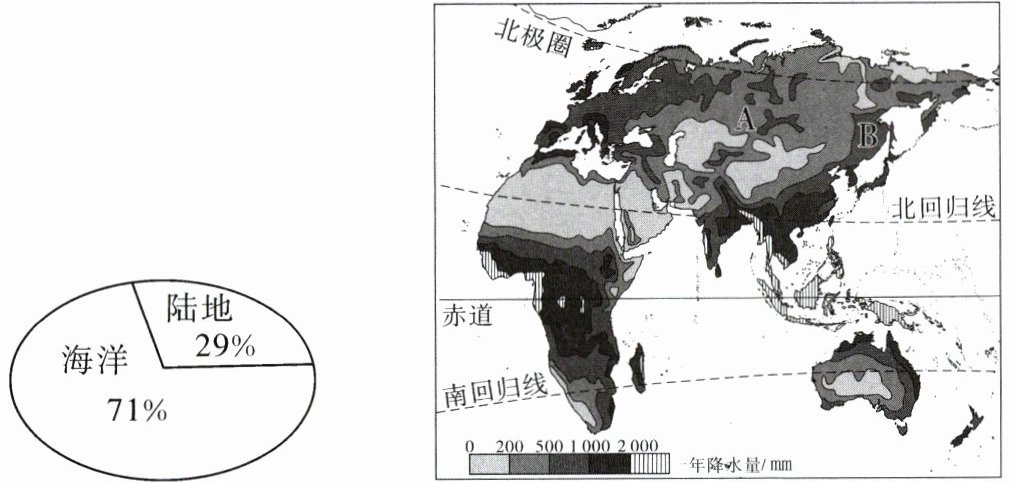 22. 水是生命之源。下图为世界海陆面积比较图、世界年降水量的分布(局部)图。读图回答下列问题。(12分)