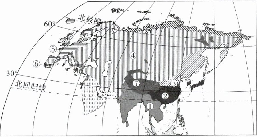 (1)在亚洲东部,①处是______带季风气候,②处是______带季风气候,③处是______带季风气候。①②③三地气候不同,影响因素主要是______。
