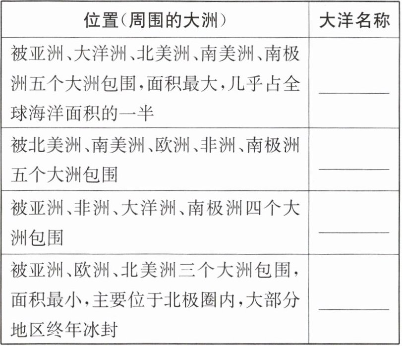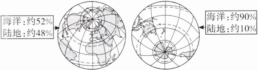 2 海陆分布特点:地球上广大的海洋彼此相连,陆地则被海洋分隔成许多大大小小的陆地。陆地主要集中在______半球,但是北极周围却是一片______;海洋大多分布在______半球,而南极周围却是一块______。即使在陆地分布最为集中的陆半球,海洋面积仍然大于陆地面积。