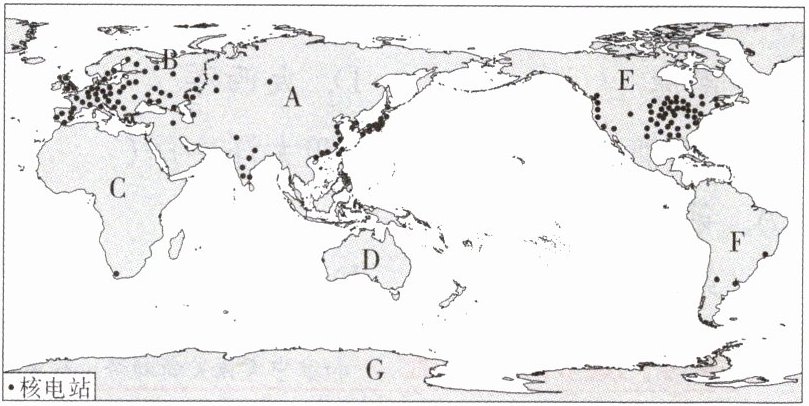 (2024·陕西渭南白水一模)目前,我国已成为全球少数几个拥有比较完整的核工业体系的国家之一,核电技术水平和综合实力跻身世界第一方阵。核电的重要原料为铀矿石。读全球核电站分布图,回答 9~10 题。