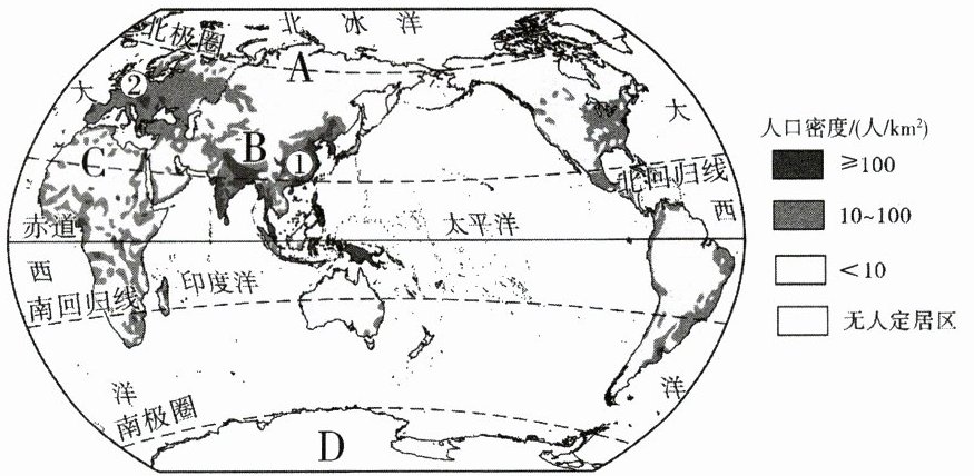 (2)图中的A、B、C、D四个地区中,没有人口定居的是______,原因是那里______。A、B、C、D四个地区中,因气候炎热干燥而人口稀少的地区是______。