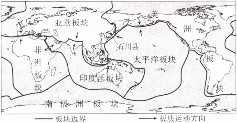 (2024·新疆中考)2024年1月1日,日本石川县发生7.6级地震,地震导致该地区地壳大幅变动。下图为世界六大板块示意图。据此回答5~6题。