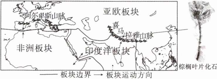 跨学科 棕榈叶片化石 古生物学家在青藏高原地区发现了距今约2500万年的棕榈叶片化石。现存的棕榈科植物主要分布在热带和亚热带的低海拔地区。右栏图为板块分布示意图(局部)和棕榈叶片化石图。据此回答7~8题。