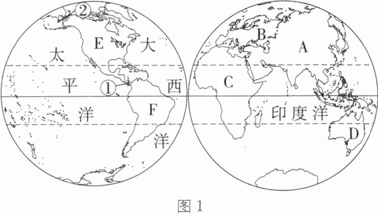 (3)大洲与大洲之间往往以山脉、河流、湖泊、运河、海峡等地理事物为分界线。读图1可知,①为E、F两大洲的分界线______运河,②为A、E两大洲的分界线______海峡。